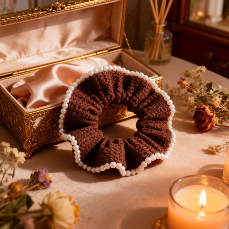 Designed with a luxurious knit fabric and finished with a classic pearl trim, this scrunchie adds subtle sophistication to any hairstyle. Its soft construction helps protect hair while maintaining style and comfort throughout the day.